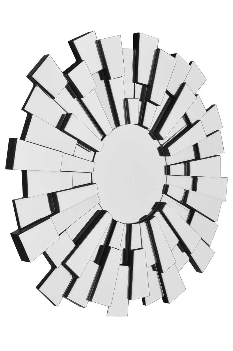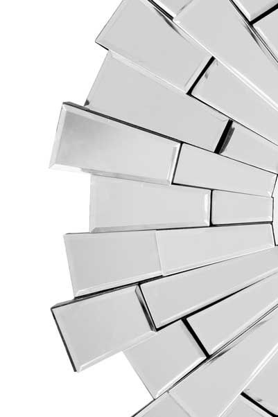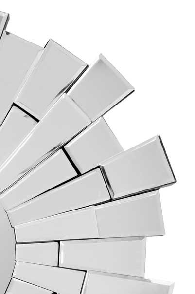 This unique modern starburst design wall mirror. The small glass panels that make up this mirror are individually handmade bevelled glass pieces and are what make this mirror so unique.